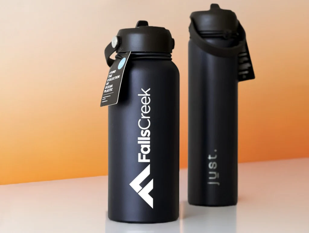 Reusable branded water bottles for promotions.