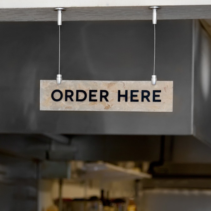 Suspended signs from ceilings or overhead beams, ideal for directing or branding in open or large indoor spaces.