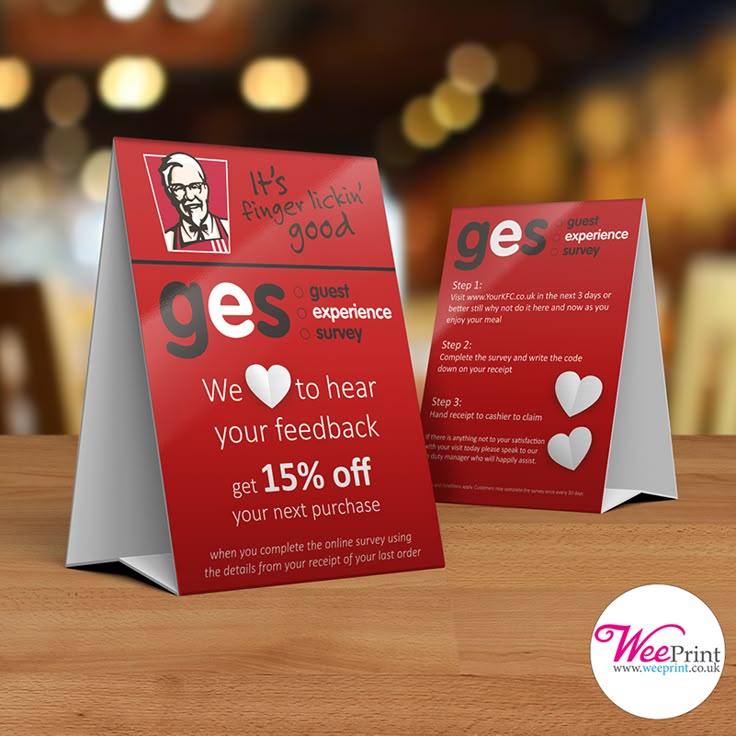 Tabletop tent cards for restaurants, events, and counters with double-sided branding.